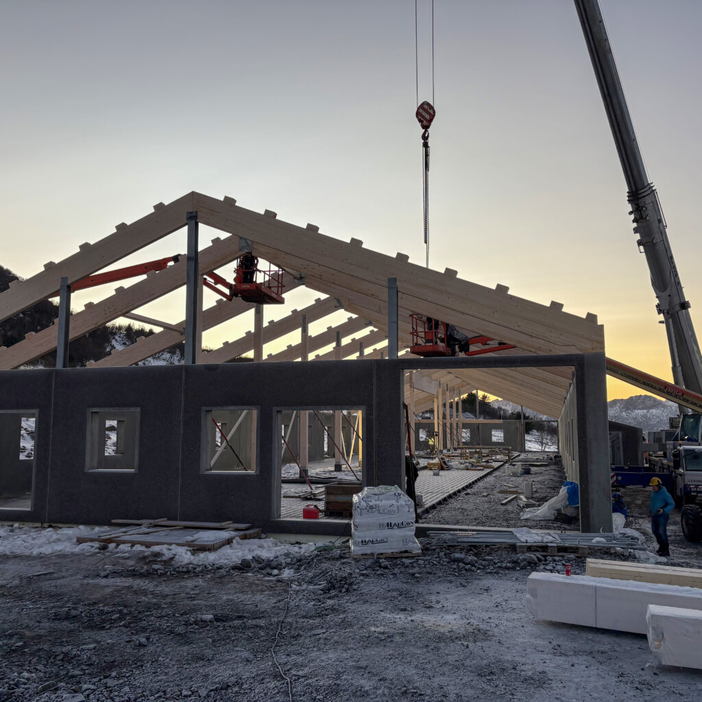 Når man bygger i Lofoten, stilles det ekstra høye krav til materialvalg og konstruksjon. For å sikre et bygg som tåler vær og vind i mange tiår fremover, er det valgt en kombinasjon av solide betongløsninger og overbygg i limtre.