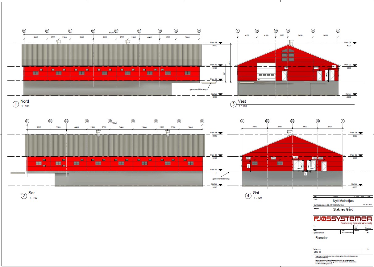 Fjøssystemer Bygg leverer stålkonstruksjon, limtreåser, vegg og takpanel i sandwich med dører, vinduer og port. Innvendige servicerom er bygd med sandwich.