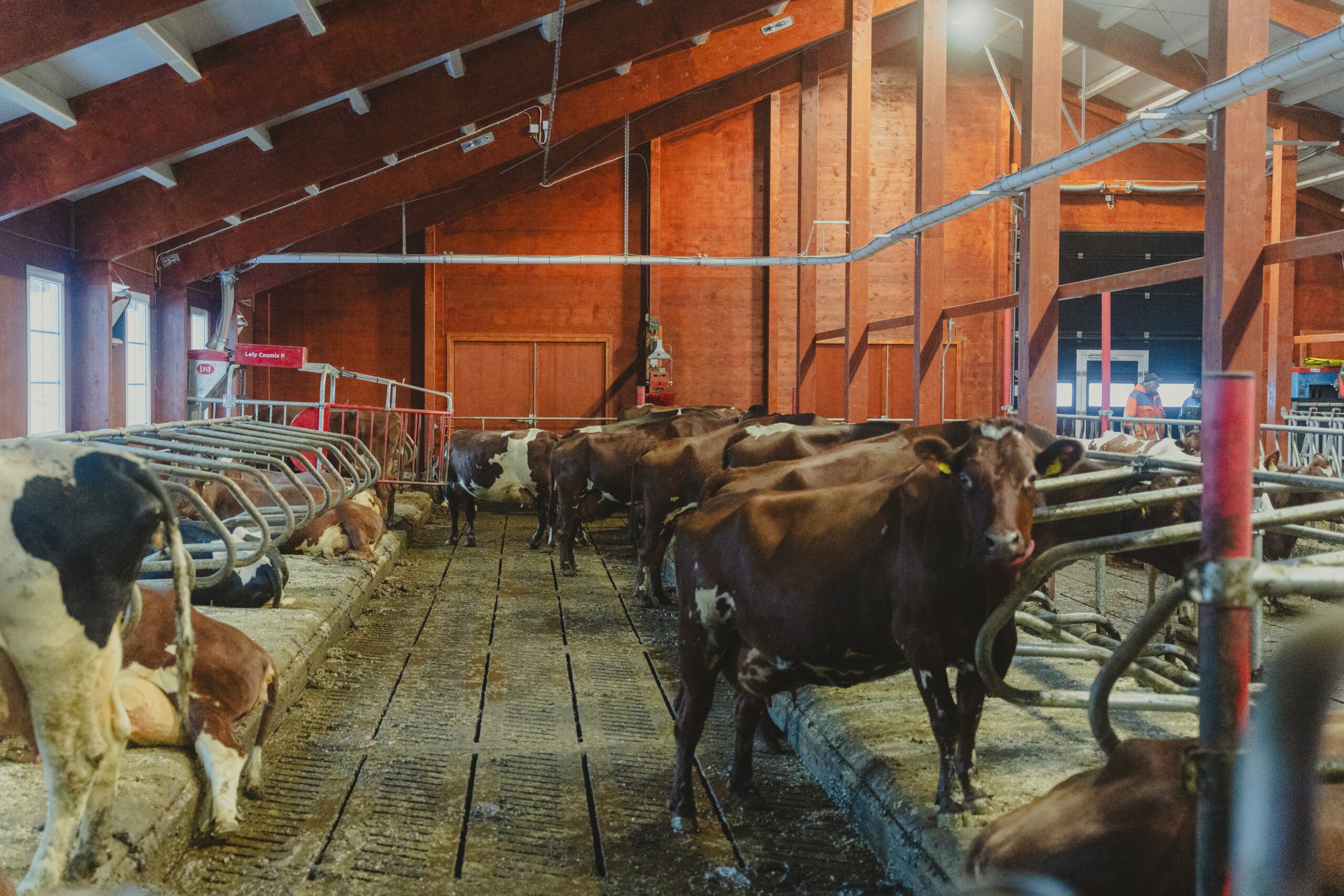 Fjøset er dimensjonert for en to-rekkers liggebåsløsning og er klargjort for fullautomatisert melking. En viktig del av konstruksjonen er den hybride ventilasjonsløsningen. Her har Steinar Myhre AS levert et bygg med store veggventiler og et spesialutviklet luftemøne i taket, som sikrer kontinuerlig frisk luft uten bruk av mekaniske vifter.